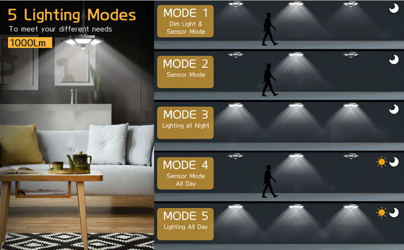 OSensor de movemento solar para exteriores ilumina con 5 modos de iluminación.