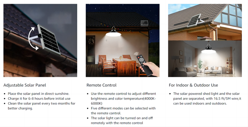 3. IP65 Impermeable e Fácil Instalación A luz impermeable para exteriores das luces solares do graneiro ten un deseño impermeable IP65 e está conectada ao panel solar cun cable de 16,4 pés.