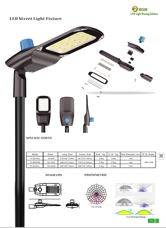 | EK-BL04(S) | 618*230*116 | 20 W-80 W (poste de luz 60 mm) | Carcasa de aluminio, vidro temperado, anel de goma, parafusos |