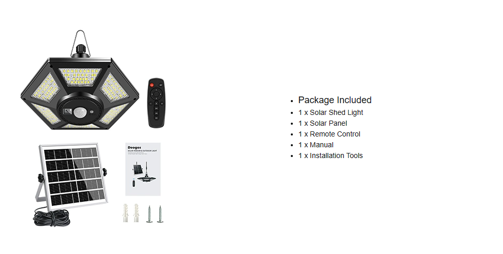 | Compoñentes incluídos | Solar Panel, Remote Control, Mounting Hardware, Light Fixture |