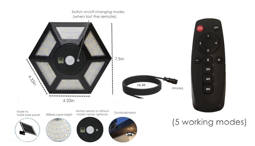 Remote control:9.8-16.4ft under the light, Sensor angle:360Degree, IP65 Waterproof level.